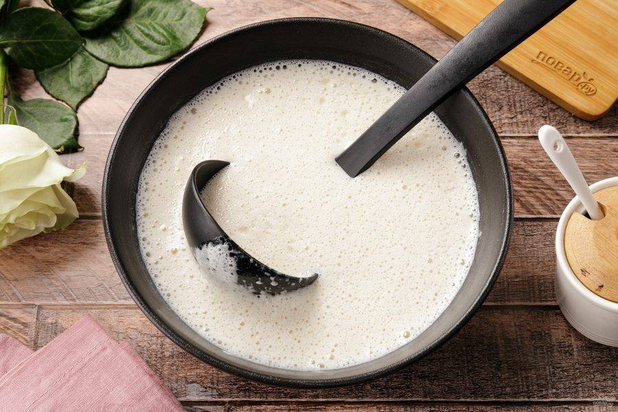 Хорошо нагрейте сковороду, смазанную растительным маслом. Налейте половником тесто и равномерно распределите по сковороде.