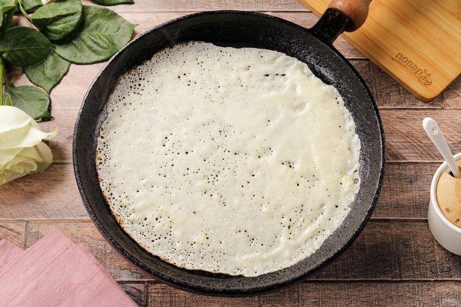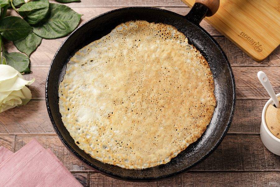 Как только нижняя сторона блинчика станет золотистого цвета — переверните и поджарьте с другой стороны.