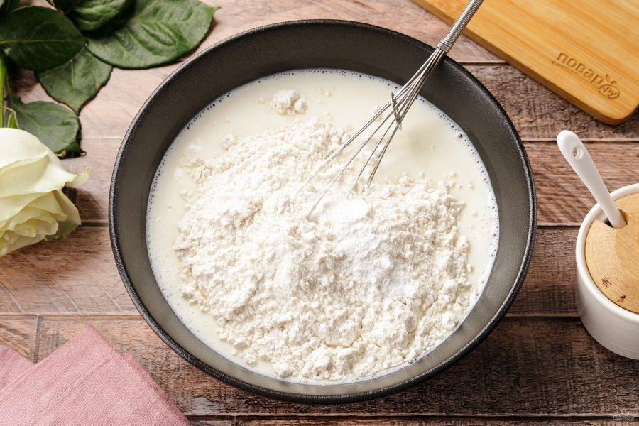 Затем добавьте муку и разрыхлитель. Перемешайте всё до исчезновения комочков. Вот тут можно воспользоваться миксером или блендером, так получится намного быстрее.