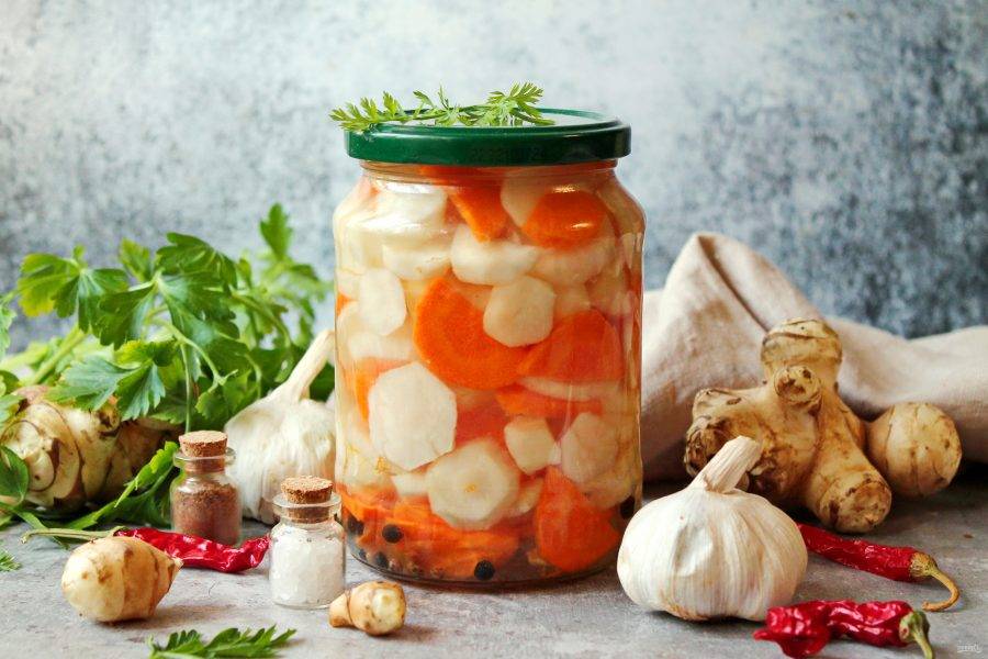 Подготовьте все необходимые ингредиенты для приготовления топинамбура на зиму. Морковь и топинамбур тщательно вымойте жесткой щеткой от земли. Банки тщательно вымойте и простерилизуйте любым удобным способом, крышки прокипятите.