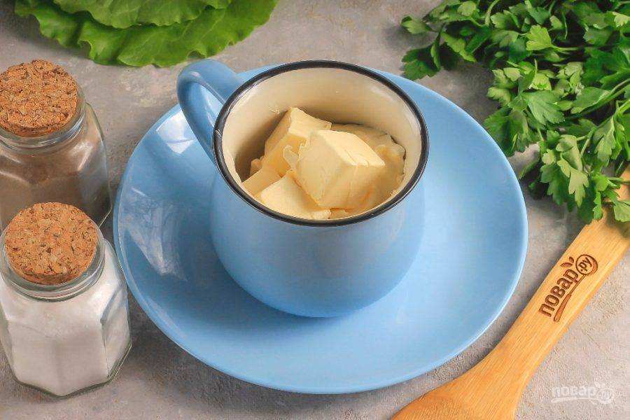 Масло нарежьте средними кубиками или брусочками, чтобы оно быстрее растопилось. Если емкость не стеклянная и не фаянсовая, то вы можете прогреть духовку заранее.