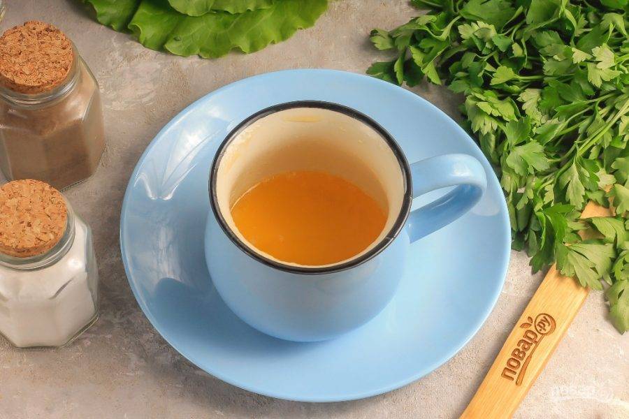 Выложите нарезку масла в высокую огнеупорную емкость и поместите его в духовку. Духовку разогрейте до 180 градусов и протомите масло примерно 10 минут.