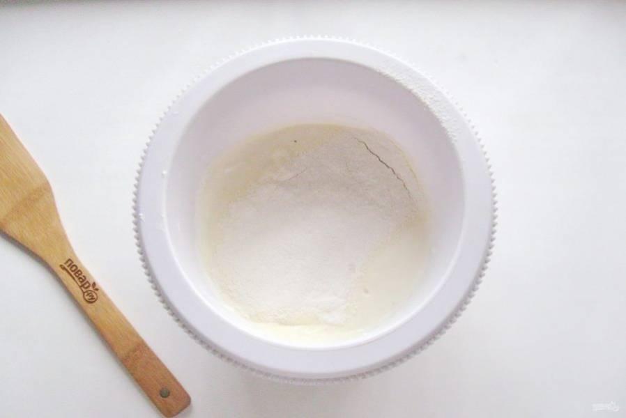 Всыпьте разрыхлитель теста. Постепенно добавьте просеянную муку и аккуратно перемешайте тесто лопаткой.