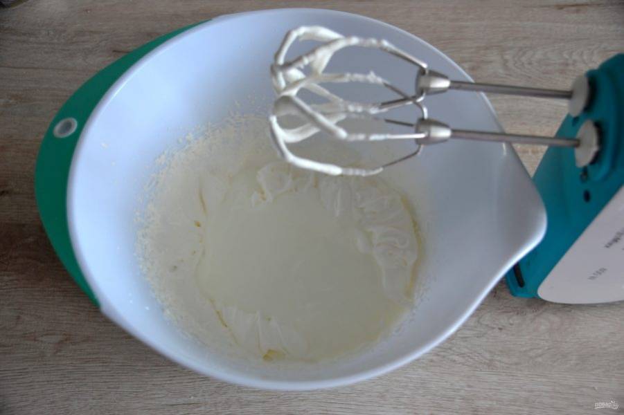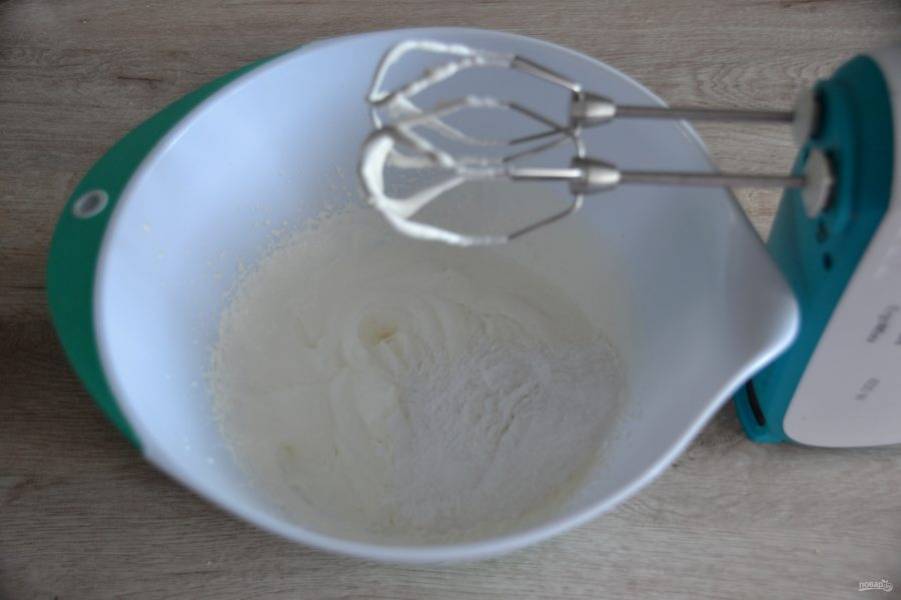 Взбейте охлажденные сливки в пышную массу, добавьте сахарную пудру, взбейте с пудрой.