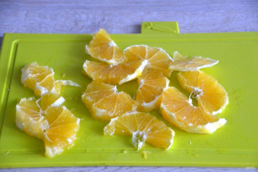 Очистите 2 апельсина от кожуры, нарежьте 1 апельсин полудольками, 1 апельсин нарежьте на мелкие сегменты.