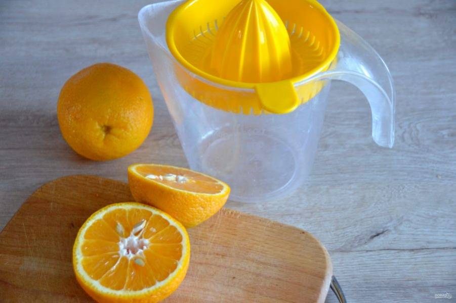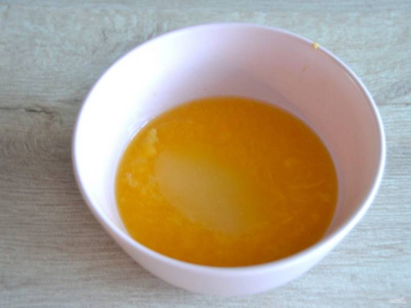 Замочите 10 грамм желатина в 100 мл. воды, точно так же, как и для суфле. Отожмите сок апельсина или пробейте апельсиновую мякоть в блендере.
