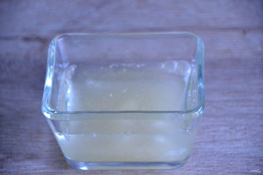 Замочите 10 грамм желатина в 100 мл. воды в соответствии с указаниями на упаковке.