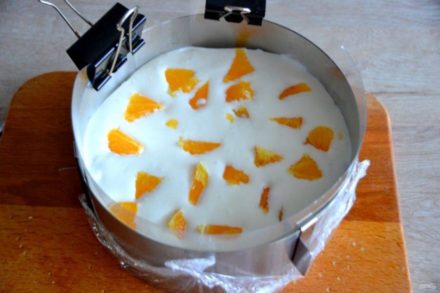 Достаньте из морозилки форму. Вдоль бортика у основания коржа выложите полукольца апельсина.