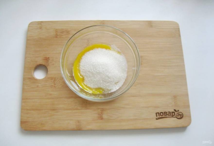 Пока коржи в духовке, приготовьте крем для торта. В мисочке смешайте желтки, сахар, крахмал.