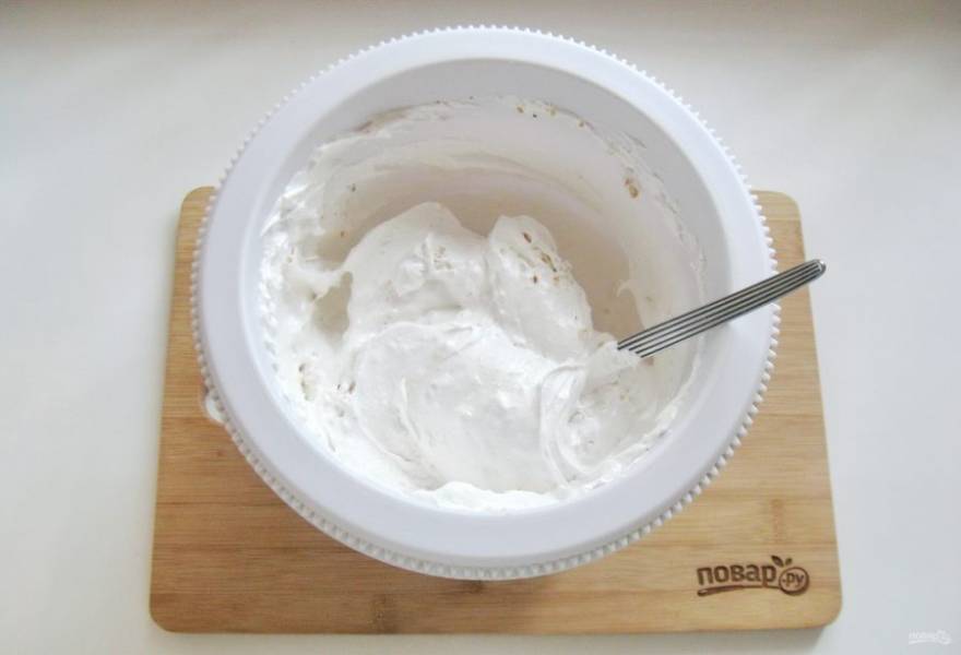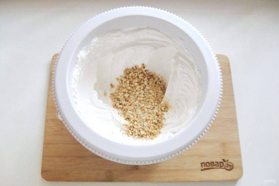 Арахис подсушите на сковороде или в духовке. После измельчите и добавьте к взбитым белкам.