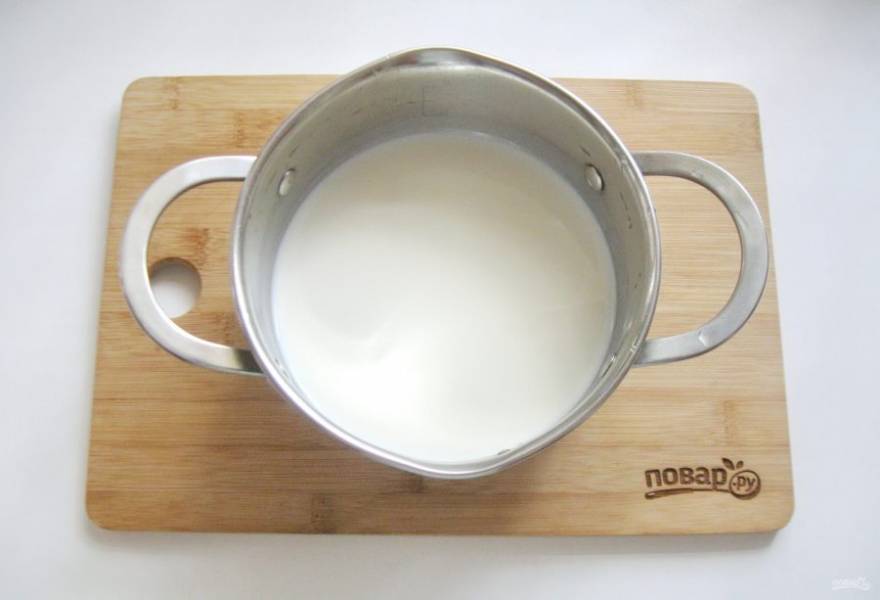 Молоко налейте в кастрюлю с толстым дном и поставьте на плиту.