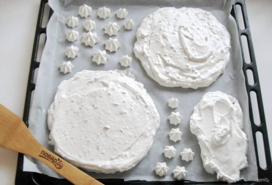 На пергаменте нарисуйте два круга диаметром 18-20 см. Выложите на них белки с арахисом и разровняйте. Отложенные белки без орехов выложите на пергамент также. Форма произвольная. Это будет посыпка для боков торта. Из остальной белковой массы без орехов с помощью кулинарного мешка с насадкой отсадите цветочки.