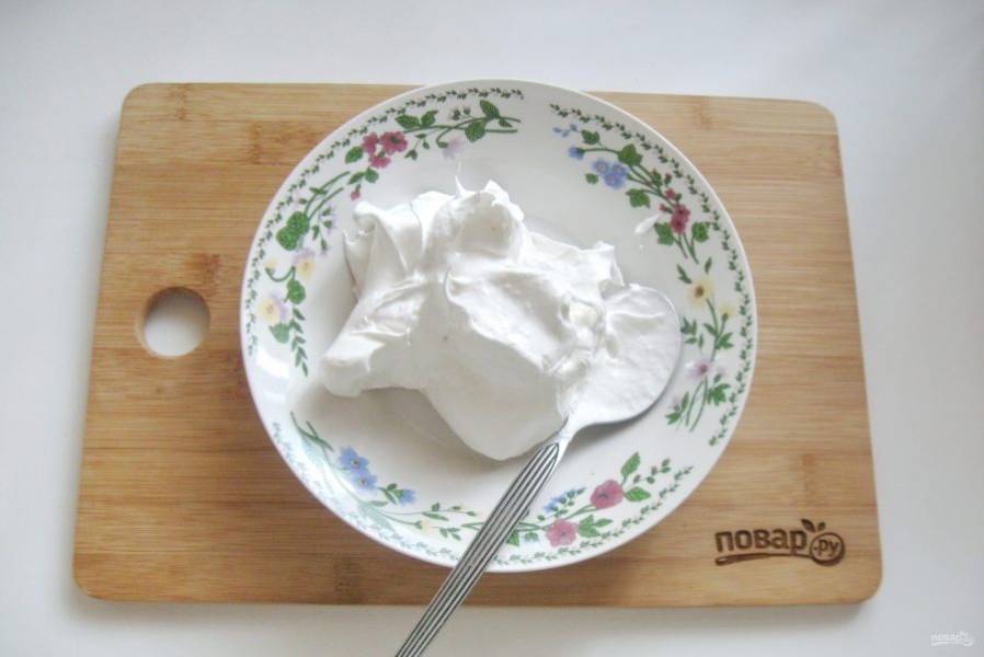 В сухую, чистую, глубокую посуду выложите белки 6-7 яиц. Взбейте миксером в устойчивую пену. Постепенно всыпьте ванильный сахар и обычный сахар, не переставая взбивать. Должна получится густая, плотная масса, похожая на зефир.