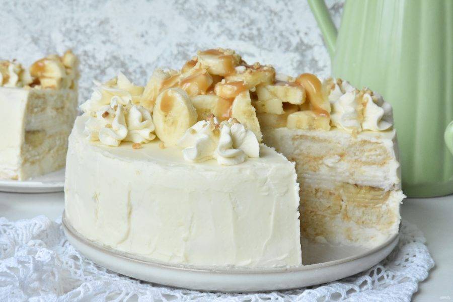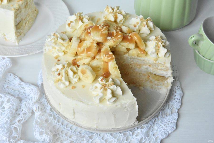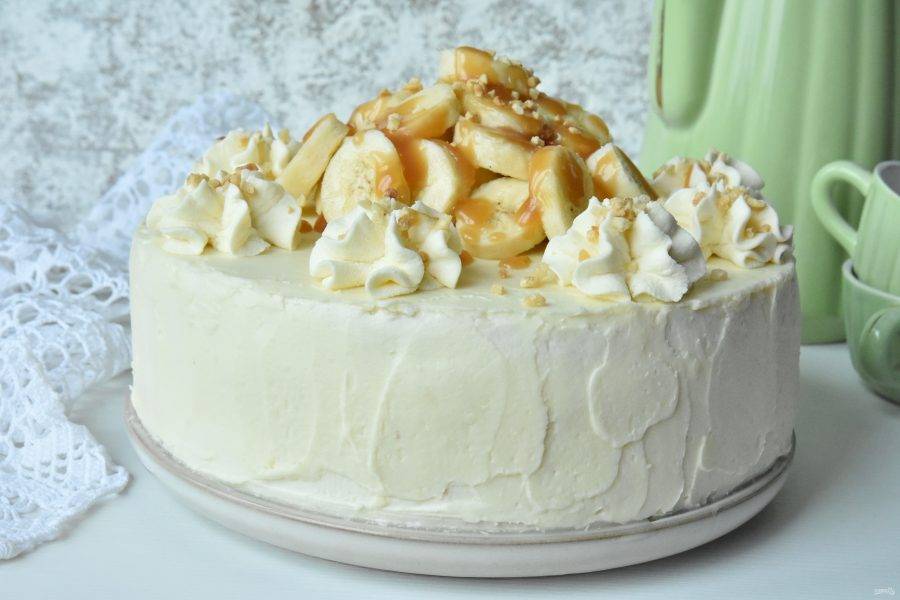 Нанесите крем на охлажденный торт и разровняйте его по бокам и верху. Украсьте торт оставшимся кремом и бананами.