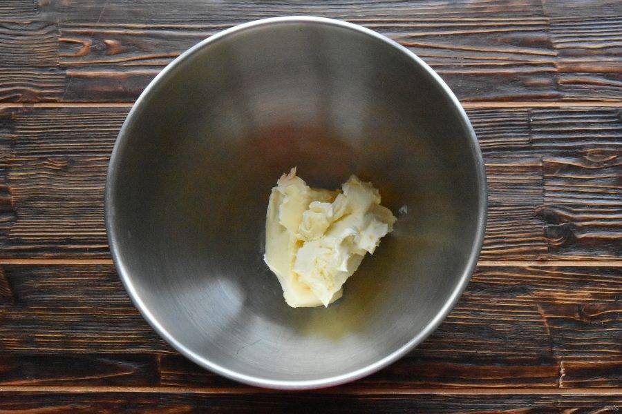 В дежу кухонной машины выложите мягкое сливочное масло и взбейте до пышности.