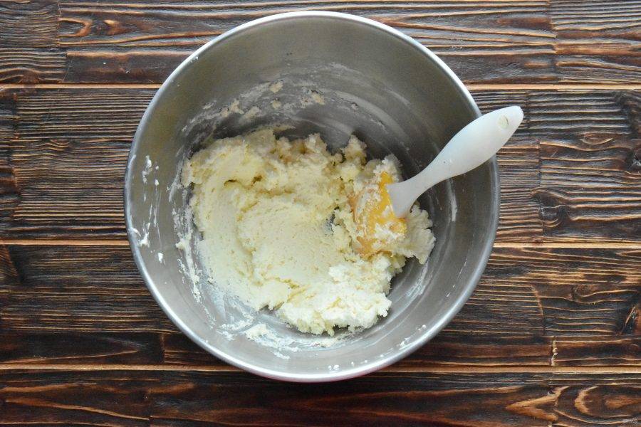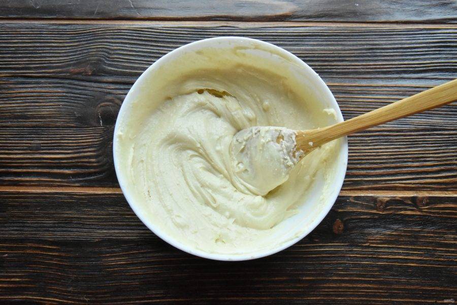 В взбитое мягкое сливочное масло, продолжая взбивать, частями введите заварную молочную смесь. Взбейте компоненты в белую пышную массу. Все составляющие должны быть одной температуры.