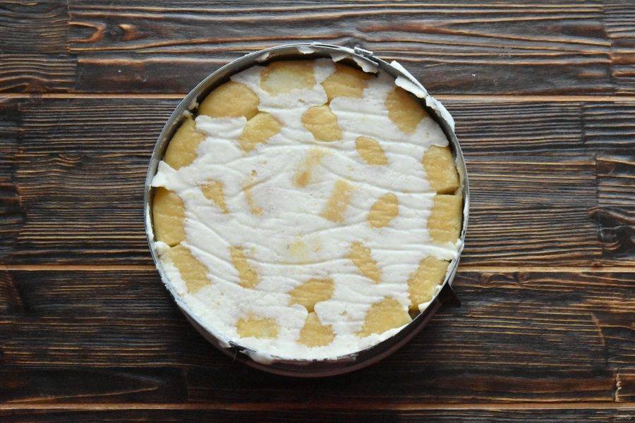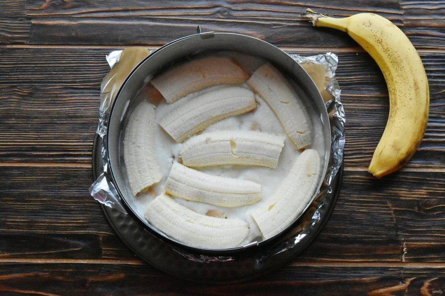 Подготовьте форму для сборки торта. Переложите в нее половину получившейся массы из печенья и заварного крема. Разровняйте поверхность и разложите половинки бананов, плотно укладывая их друг к другу. Сверху на бананы выложите оставшуюся часть крема с печеньем. Накройте форму пищевой пленкой и оставьте торт пропитываться на 6-8 часов.