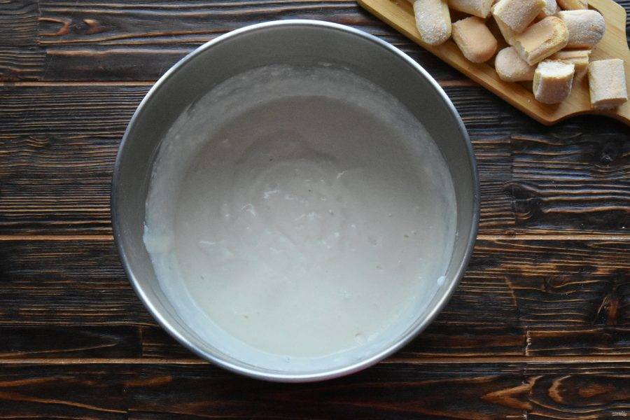 В заварной крем переложите кусочки подготовленного печенья савоярди. Перемешайте массу, чтобы крем покрыл все кусочки печенья.