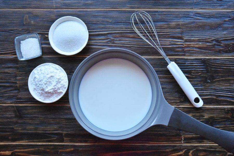 В сотейник влейте молоко и сливки, добавьте сахар и ванильный сахар. 50 миллилитров молока оставьте для разведения кукурузного крахмала. Нагрейте молочную смесь и введите разведенный в молоке крахмал. Непрерывно помешивая, доведите молоко до кипения.