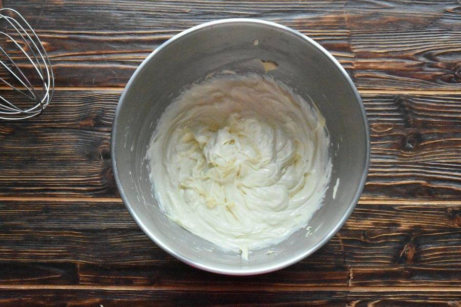Для выравнивания торта подготовьте крем на основе сливочного масла, творожного сыра и белого шоколада. Все ингредиенты для приготовления крема должны быть одинаковой температуры. Мягкое сливочное масло взбейте до пышного состояния. Продолжая взбивать, введите творожный сыр. Масса должна получиться однородная и пышная.