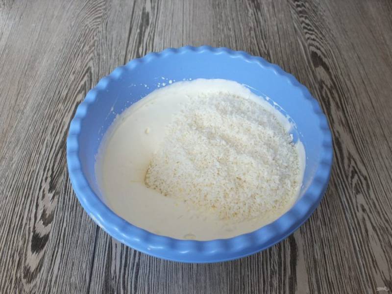 К сливкам добавьте оставшееся сгущенное молоко, кокосовую стружку. Еще раз взбейте.