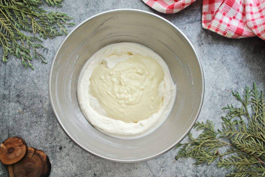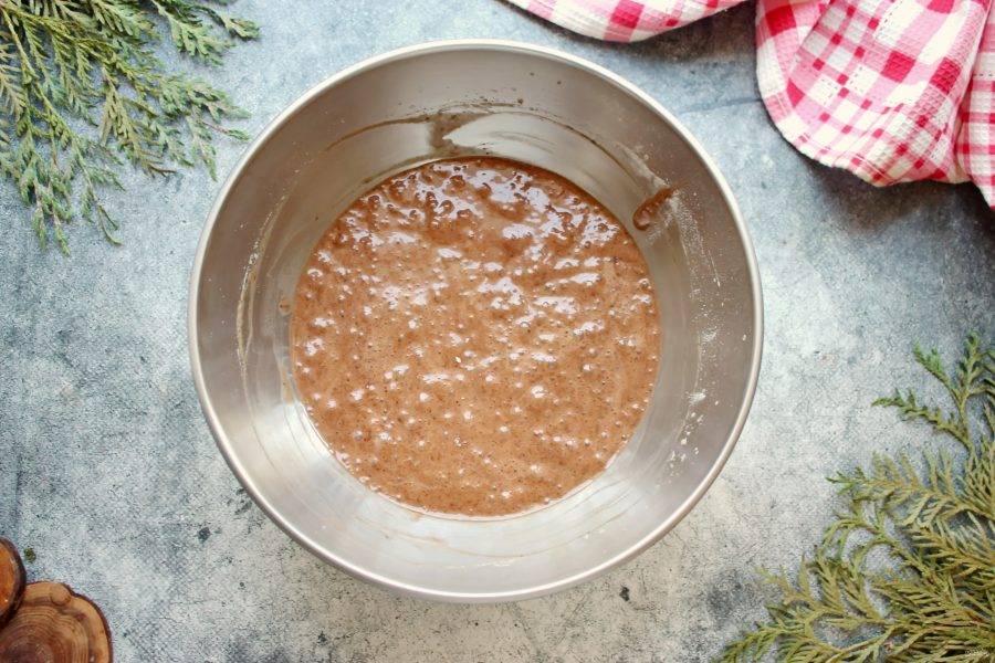 Соедините обе массы и аккуратно перемешайте. Муку соедините с какао порошком, разрыхлителем и просейте в яичную массу. Все аккуратно перемешайте до пышного, однородного теста.