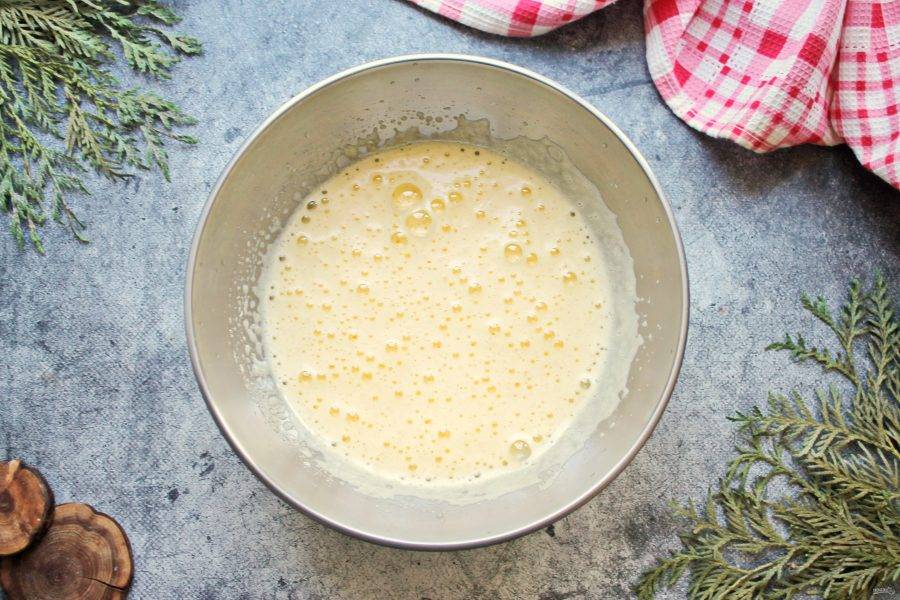 Яйца разбейте в миску, добавьте соль, сахар и взбейте в пышную, светлую массу.