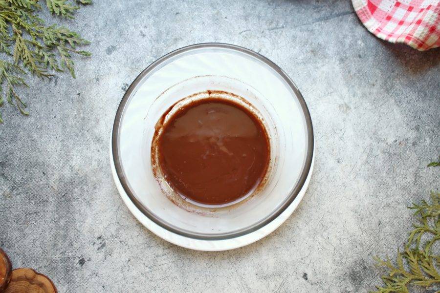 Горький шоколад порежьте, соедините со сливочным маслом и разогрейте на водяной бане, мешая, до однородности. Шоколадную смесь остудите.