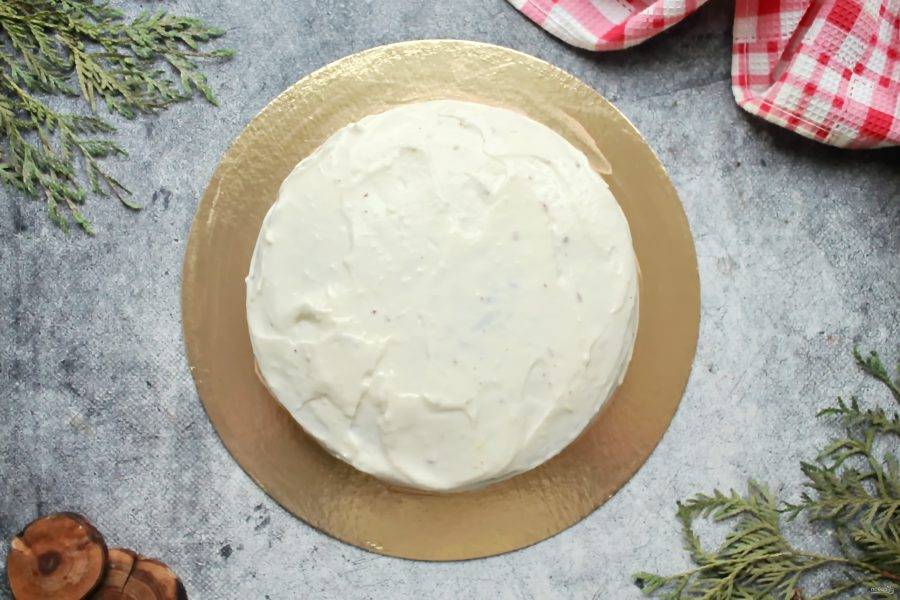 Соберите торт. Каждую часть, верх и бока смажьте и выровните кремом.