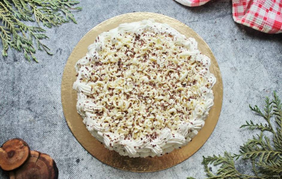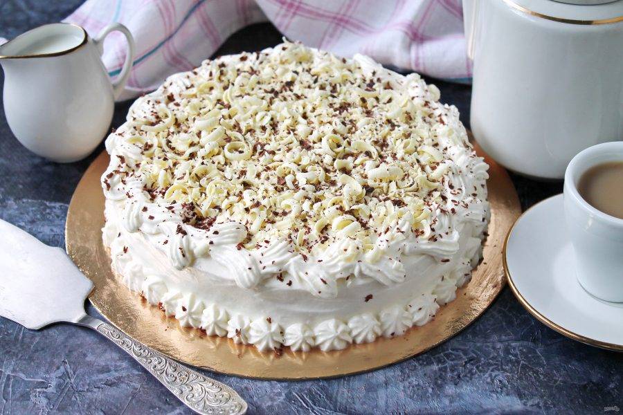 Края торта украсьте кремом, а верх тертым белым и темным шоколадом. Поставьте в холодильник на 1-2 часа и подавайте.