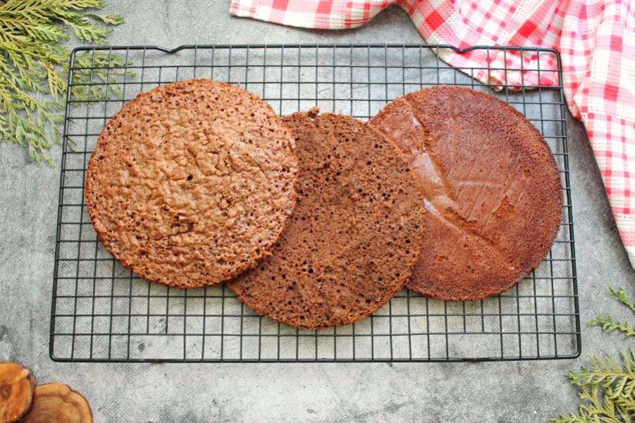 Дайте бисквиту постоять 5 минут, достаньте бисквит и остудите на решетке. Готовый бисквит разрежьте на три ровные части.