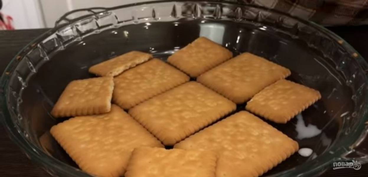 3. Добавьте к ним сахарную пудру и кокосовую стружку, снова взбейте. Печенье обмокните в молоке, дайте ему немного напитаться молоком. Выложите печенье в форму одним слоем, выложите слой крема и снова слой печенья.