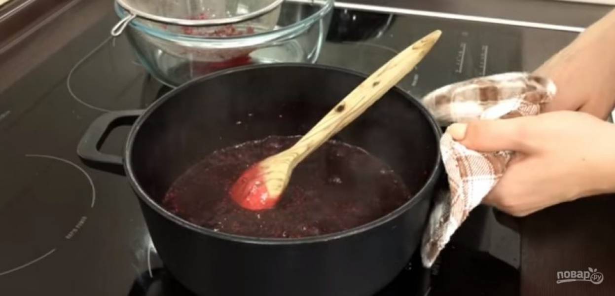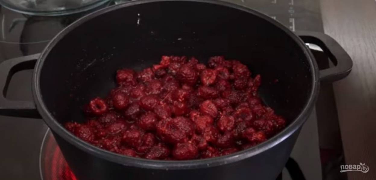 2. Когда малина начнет закипать, слегка измельчите ее до состояния пюре. Протрите готовый джем через сито и дайте ему полностью остыть. Холодные сливки взбейте миксером до пышной пены.