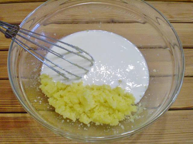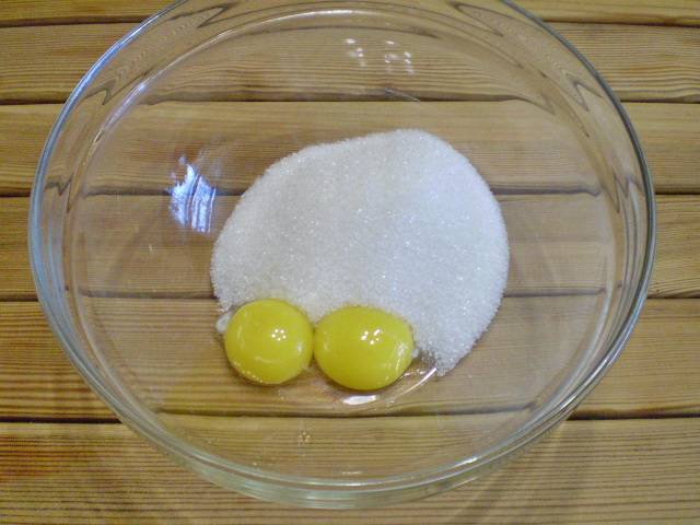 2. Разделите яйца на белки и желтки. Желтки смешайте с сахаром.
