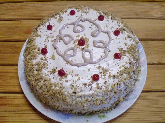 13. Для украшения черносливового торта будем использовать глазурь (третий белок взбить до пиков, ввести половину стакана сахарной пудры) и ягоды красной смородины.