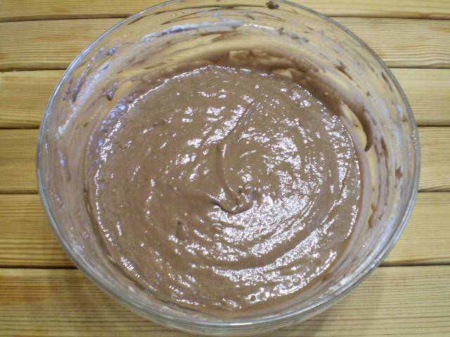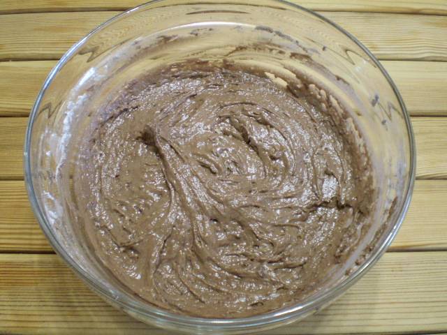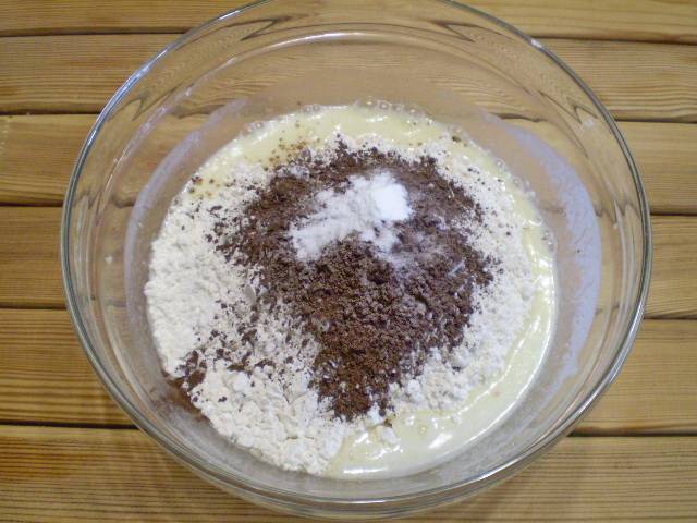 4. Добавьте муку, какао, соду. Влейте уксус в тесто. Смешивайте венчиком.