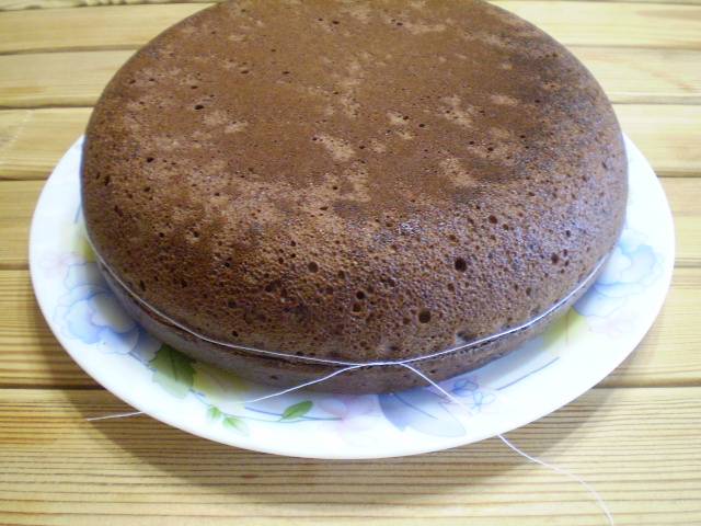 11. Режем бисквит на две части вдоль. Я делаю это ниткой.