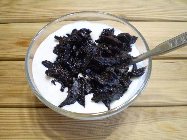 9. Пока печется бисквит, приготовим крем. Смешиваем жирную сметану с черносливом, мелко нарезанным, и сахаром.