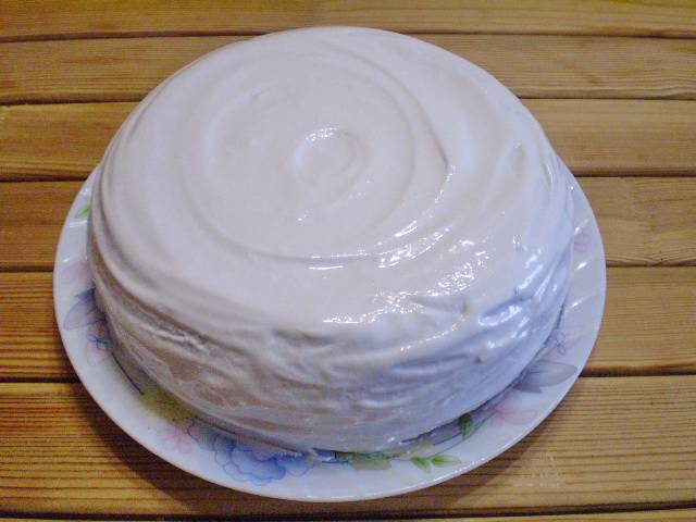 12. Щедро наносим крем из чернослива и сметаны на корж. Накрываем вторым коржом, чуть придавливая.
