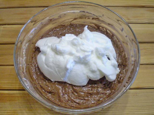 6. В отдельной таре взбейте миксером 2 белка до устойчивый пиков. Введите в тесто.