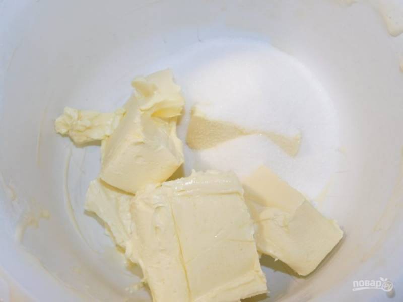 Для приготовления бисквита взбейте мягкое сливочное масло с сахаром добела.
