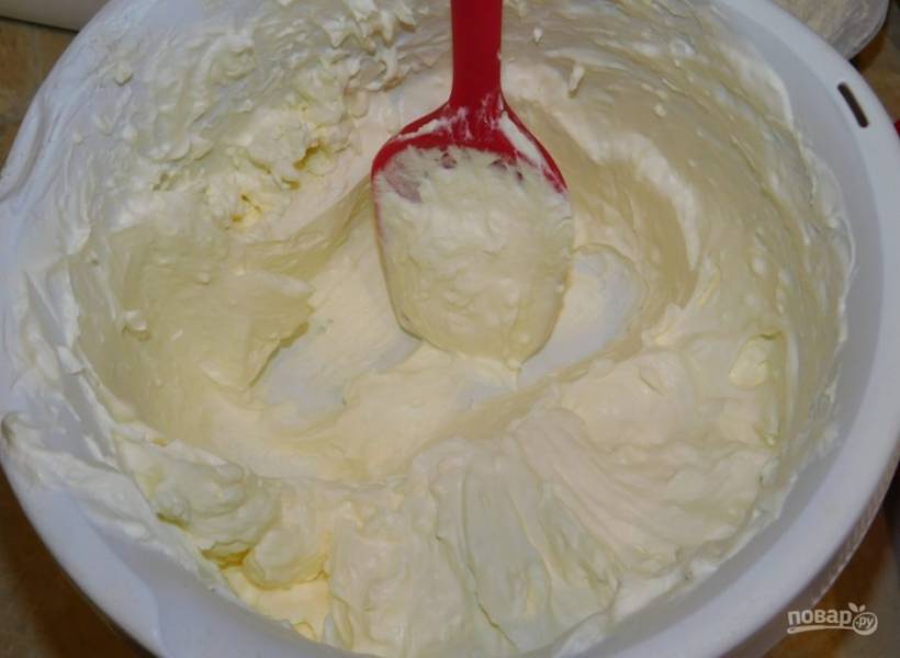 Для сырного крема взбейте 50 мл сливок, 50 гр сахарной пудры и творожный сыр.