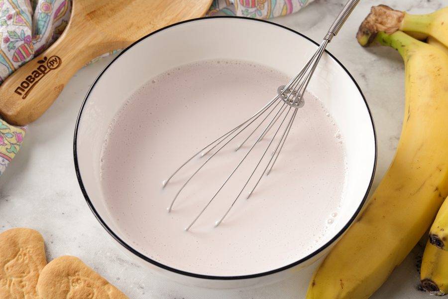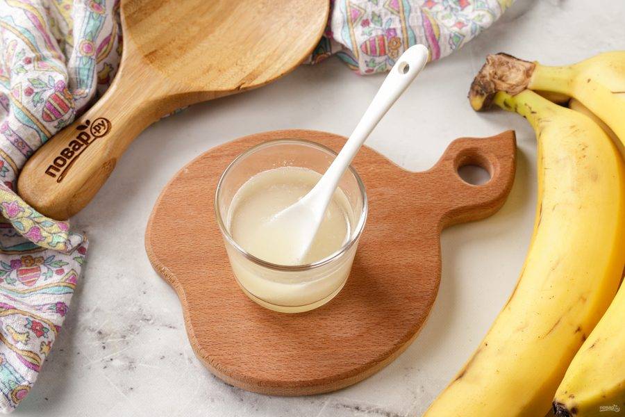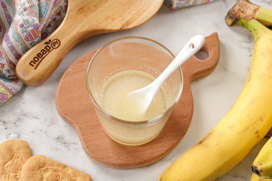 Желатин залейте водой и дайте ему набухнуть. Затем желатин слегка подогрейте до полного растворения и полностью остудите.
