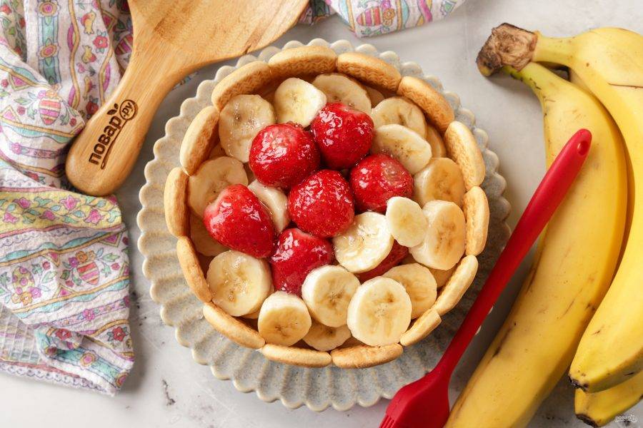 Когда слой схватится, достаньте и выложите любую начинку, у меня нарезанный банан.