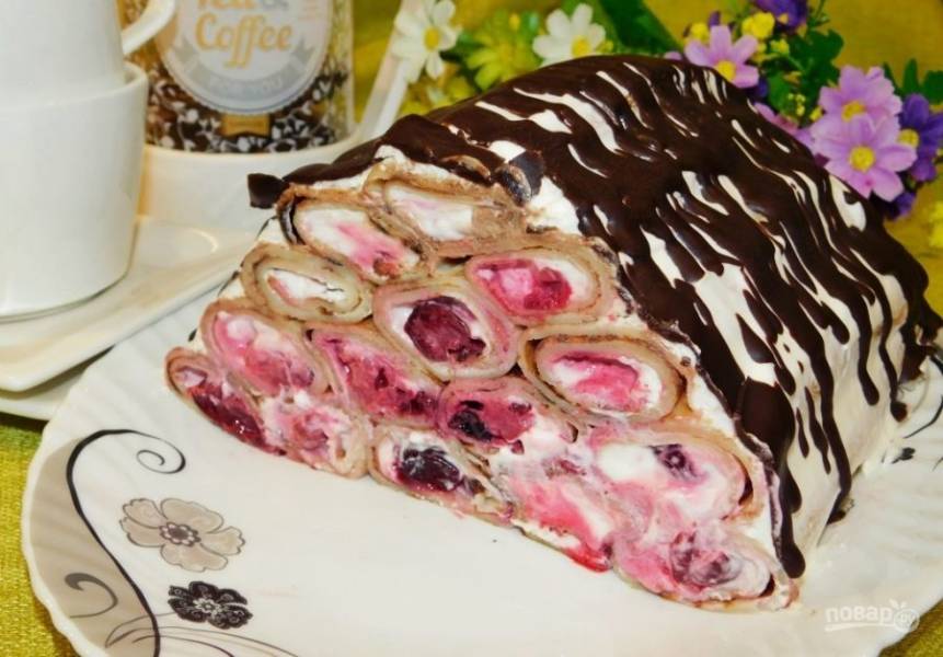 Для приготовления этого торта духовка нам не понадобится. А все потому, что готовить этот торт мы будем из блинов. Нежная начинка из сметанного крема с легкой вишневой кислинкой понравится всем!