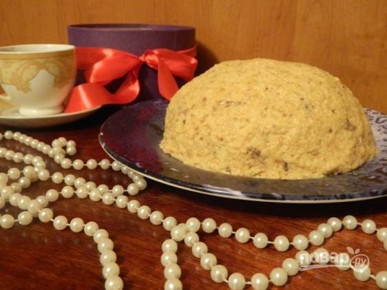 Затем выкладываем эту смесь на большую плоскую тарелку небольшой горкой. Отправляем торт в холодильник на 2-3 часа, а лучше на ночь.