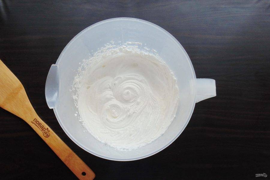 Приготовьте безе для торта. В сухой, чистой миске взбейте белки в пышную пену. Затем постепенно добавьте сахар, не переставая взбивать. Должна получиться плотная, стойкая, блестящая масса.