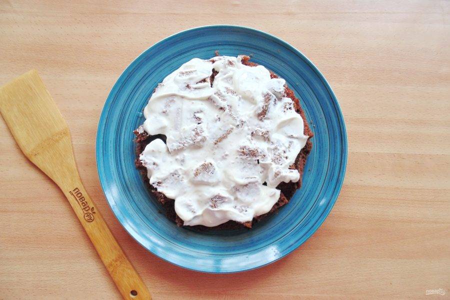 Из остывшего коржа вырежьте крут толщиной 1,5-2 сантиметра. Выложите его на блюдо.