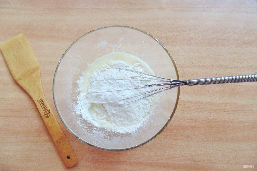 Добавьте разрыхлитель, крахмал и муку. Хорошо перемешайте.