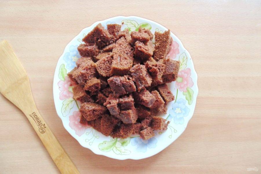 На круглый корж выложите часть кубиков и смажьте обильно кремом.